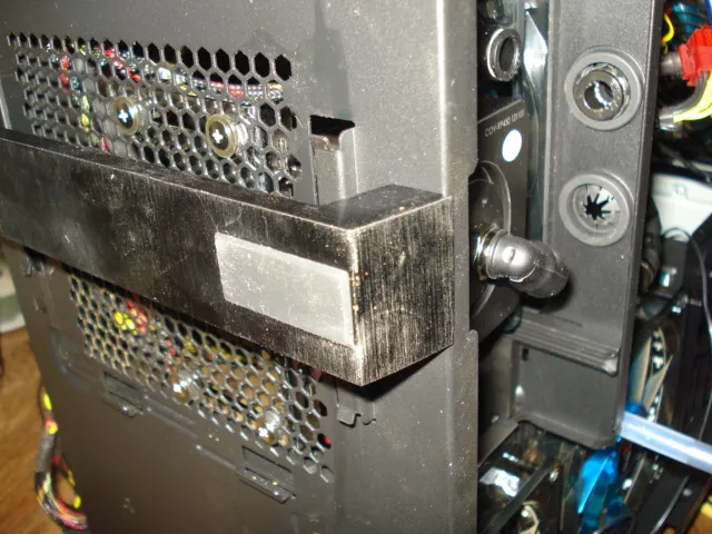 PMP-450SをCOV-RP450に組み込んだ状態で、本体のみのサイズが縦76mm、横76mm、奥行き80mmと結構大きく、今までの場所に設置できないので吸入口のラジエーターのあった場所に設置することにしました。