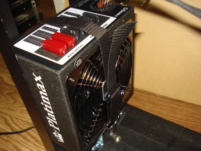 電源ユニットは1面を除いた各面に、ケーブルプラグイン・AC電源とスイッチと排気口・吸気ファンがあって、木材の底面へ固定するには新たに加工が必要になります。