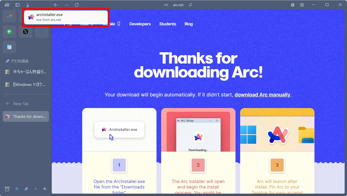 Arc公式サイト(https://arc.net/)から、ブラウザアプリのインストーラをダウンロードします。