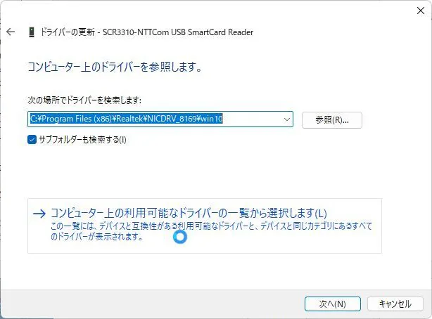 「コンピュータ上の利用可能なドライバの一覧から選択します」をクリックします。