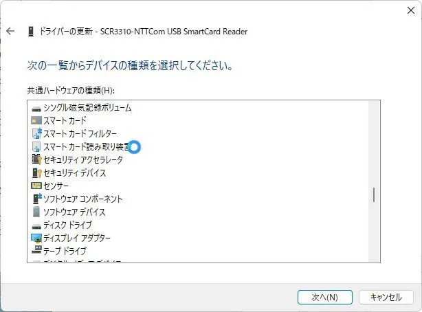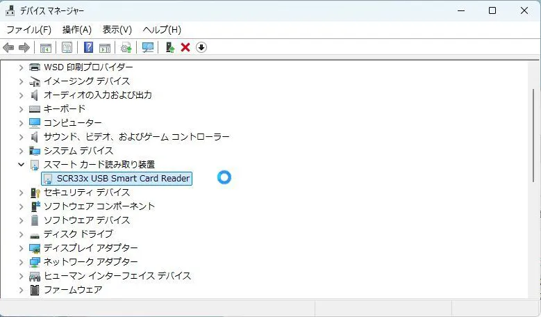 デバイスマネージャを開き、SCR3310 USB Contact Smart Card Readerの項目を探して右クリックし、ドライバの更新をクリックします。