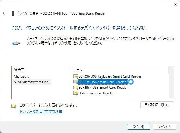 SCM Microsystems Inc.からSCR33x USB Smart Card Readerを選択し、次へをクリックします。