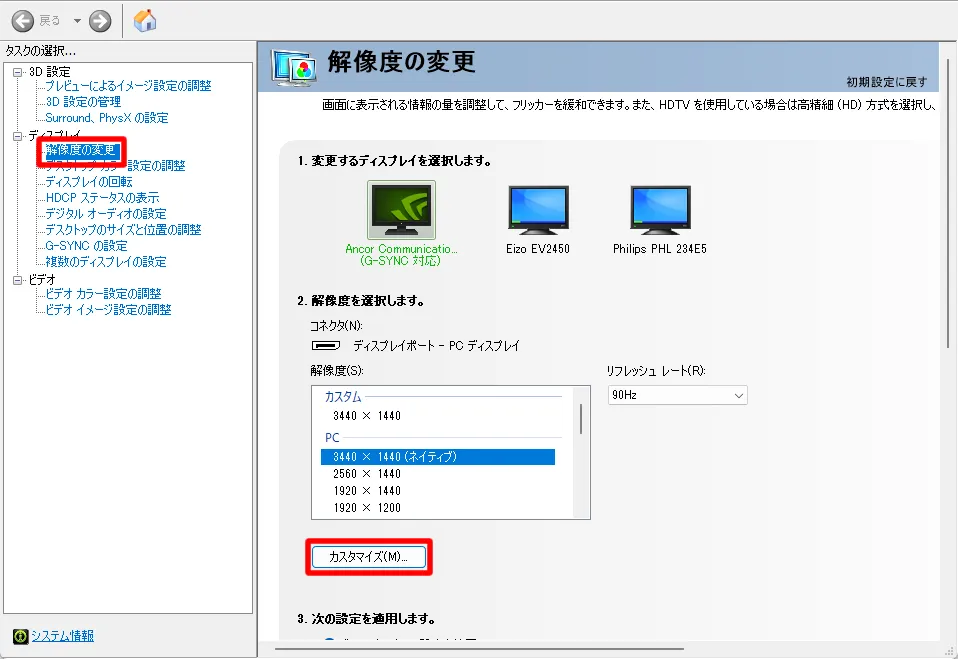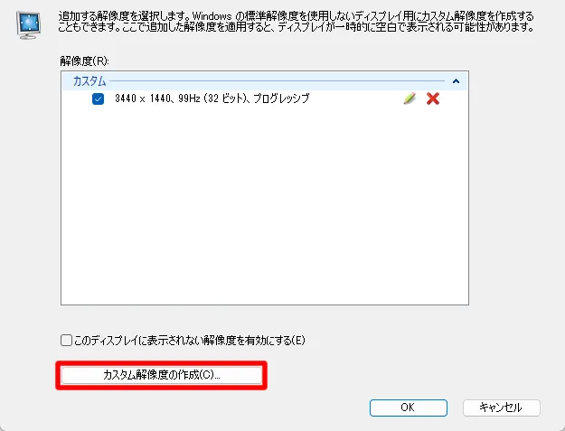 これらの設定はNVIDIAコントロールパネルからカスタムリフレッシュレートを作成することで周波数を細かく設定することができます。