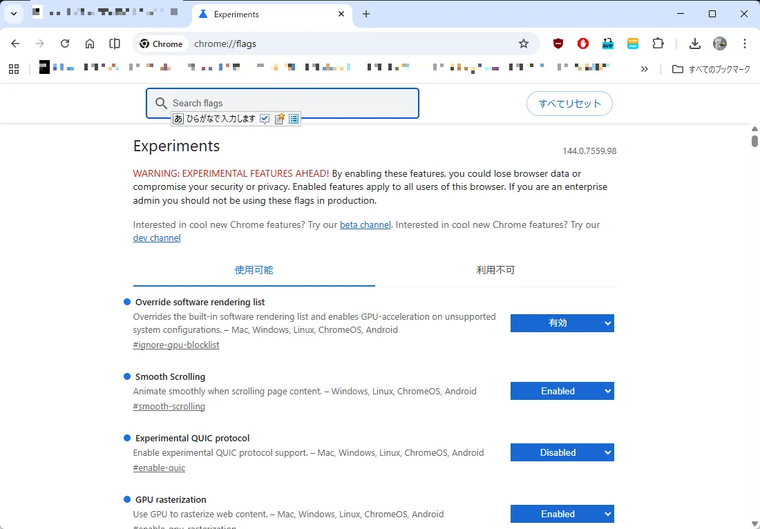 ※本バージョン(Ver 105.0.5350.0)は、次に紹介する”flagsの一部機能が動作するバージョン”の中で動作が安定しているものになります。