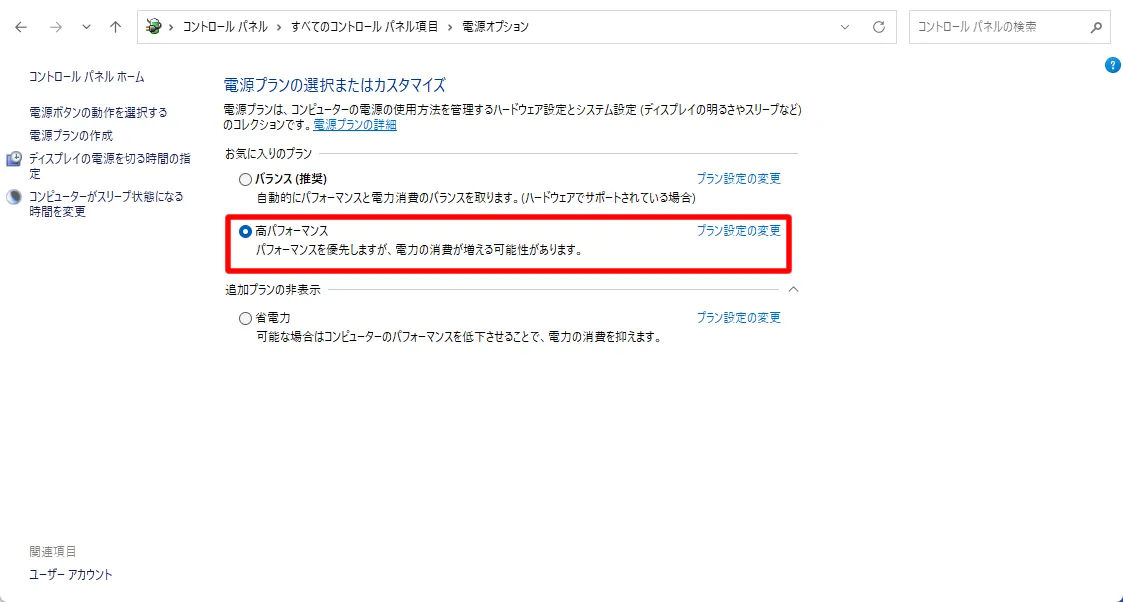 コントロールパネルからシステムとセキュリティ➡電源オプションを選択し、電源プランを高パフォーマンスに変更すると、CPUの性能を高い状態で維持することができます。