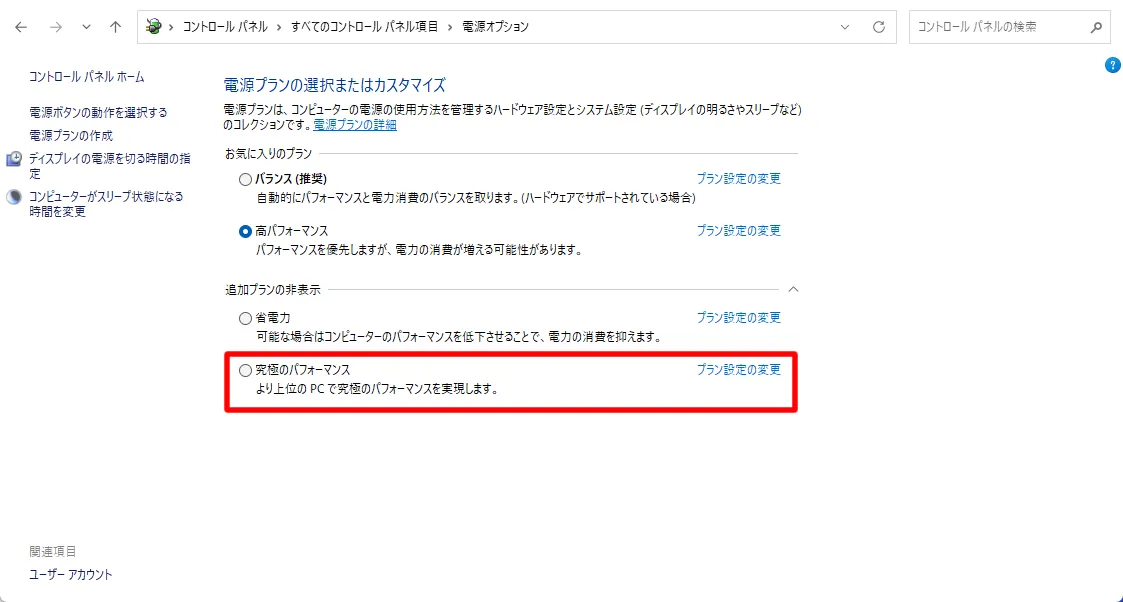 また、管理者権限でコマンドプロンプトを開き、下記のコマンドを入力して実行すると、電源オプションに究極のパフォーマンスが追加されます。