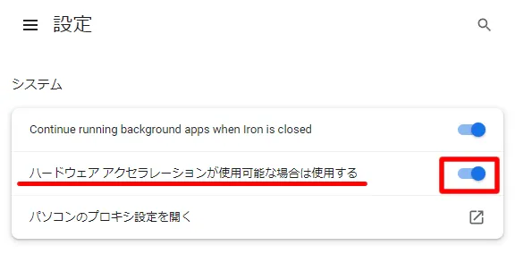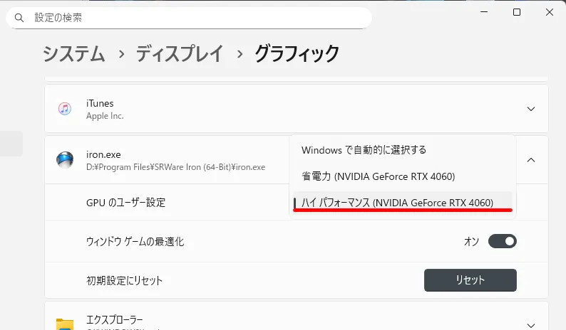 Windowsの設定➡システム➡ディスプレイ➡グラフィックへ移動し、アプリ一覧にあるchromiumとiron.exeをそれぞれオプション➡ハイ パフォーマンスに設定します。