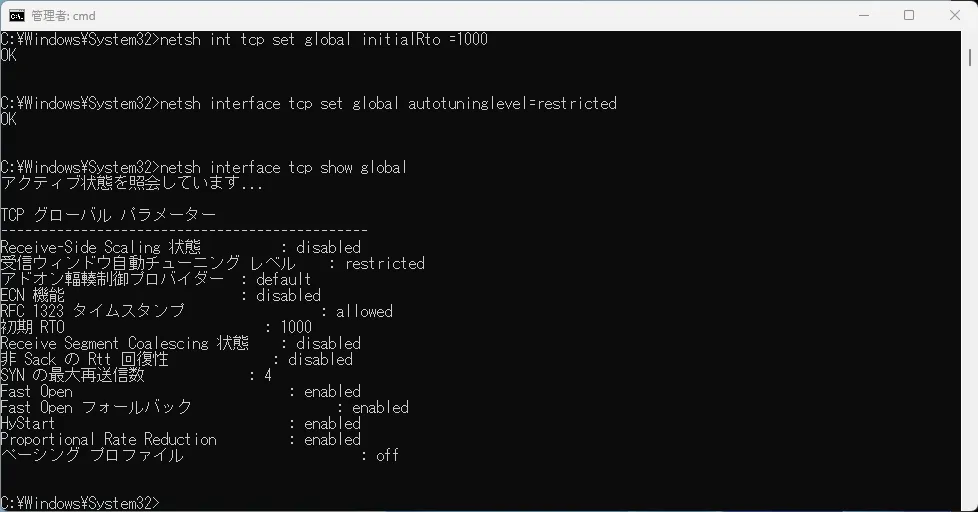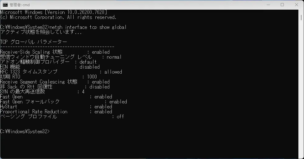 netsh interface tcp show globalを入力すると現在の設定が確認できます。