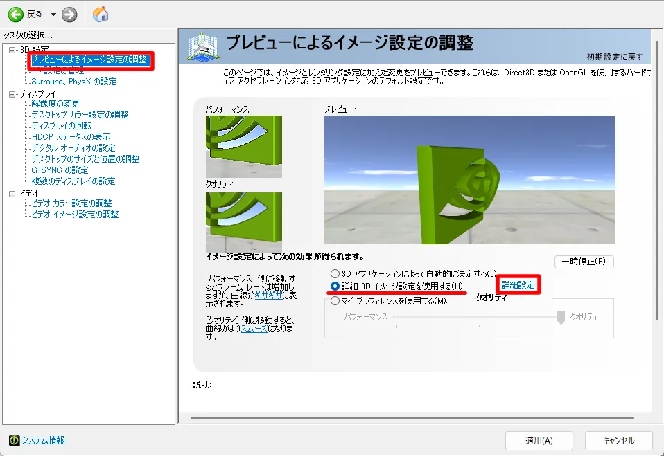3D設定➡プレビューによるイメージ設定の調整➡詳細 3D イメージ設定を使用する➡詳細設定